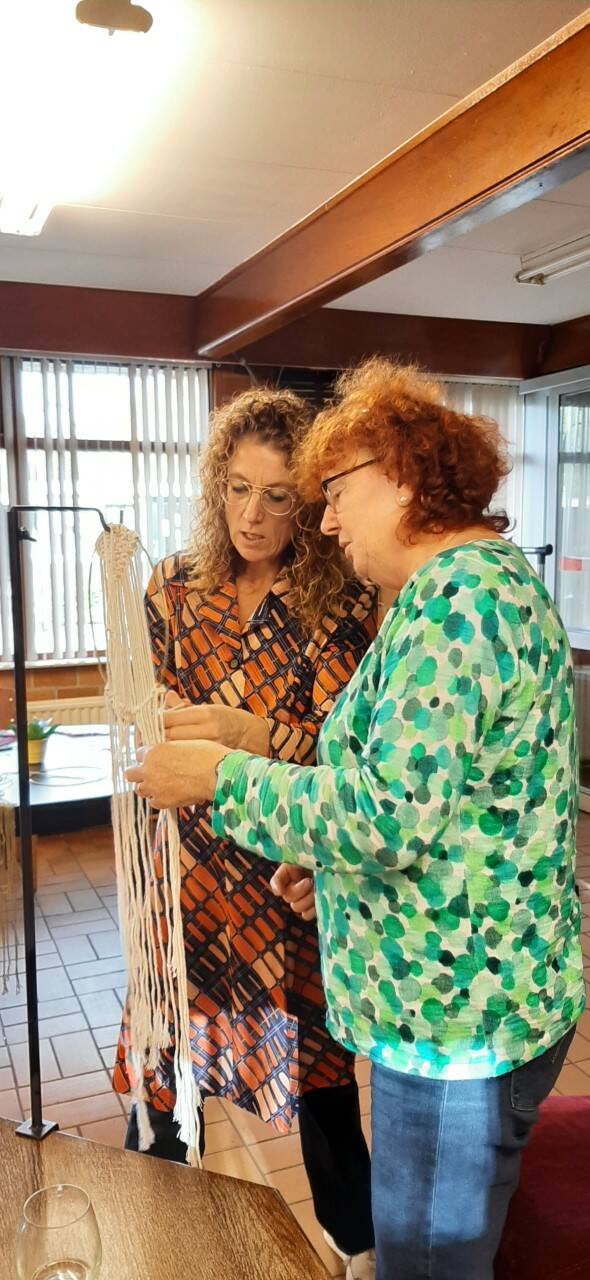 Afgelopen zondag verzamelde een aantal zeer enthousiaste dames zich in het Praathuis om een aantal uurtjes gezellig aan de slag te gaan met een gouden ring en meters katoendraad !!! Onder het genot van een kopje koffie en thee kregen we de eerste duidelijke en motiverende uitleg van Monique van MoMo's Macrame. Tja en dan lijkt het misschien wel eenvoudig maar dan blijkt het eigenlijk best lastig. De termen vlogen ons om de oren, viertje, zeiltje, wokkel, je moet er maar wijs uit zien te worden maar met het geduld van Monique en het helpen van elkaar vorderde de werkstukken bij iedereen .